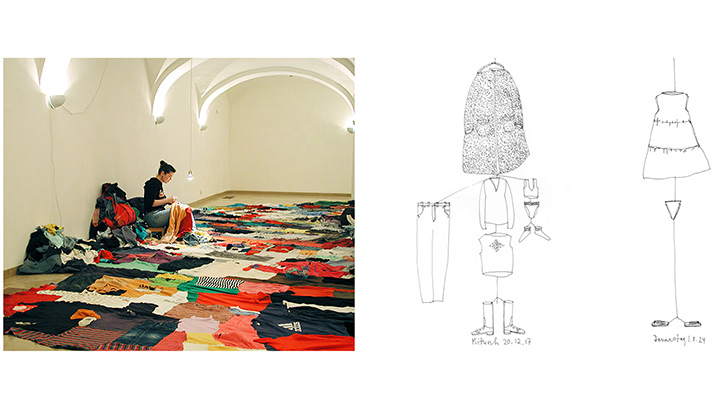 Sie als BesucherIn der Ausstellung im Haus der Kunst St.Josef sind eingeladen ein Kleidungsstück mit persönlicher Erinnerung mitzubringen, ein Kleidungsstück, von ihnen, ihrer Familie oder Freunden, das nicht mehr getragen wird, aber auch noch nicht entsorgt werden kann. Frenzi Rigling wird es als performative Handlung in ihren großen Teppich einnähen.“